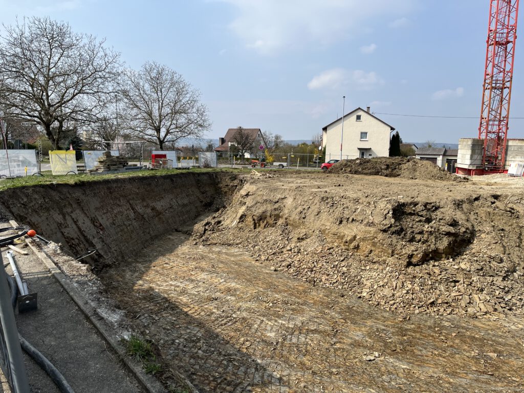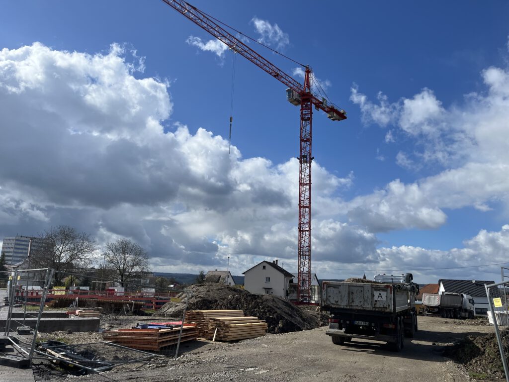 Die Baustelle wächst in die Tiefe und in die Höhe. Anfang März wurde der erste Kran gestellt und prägt nun die „Skyline“ Gomaringens.