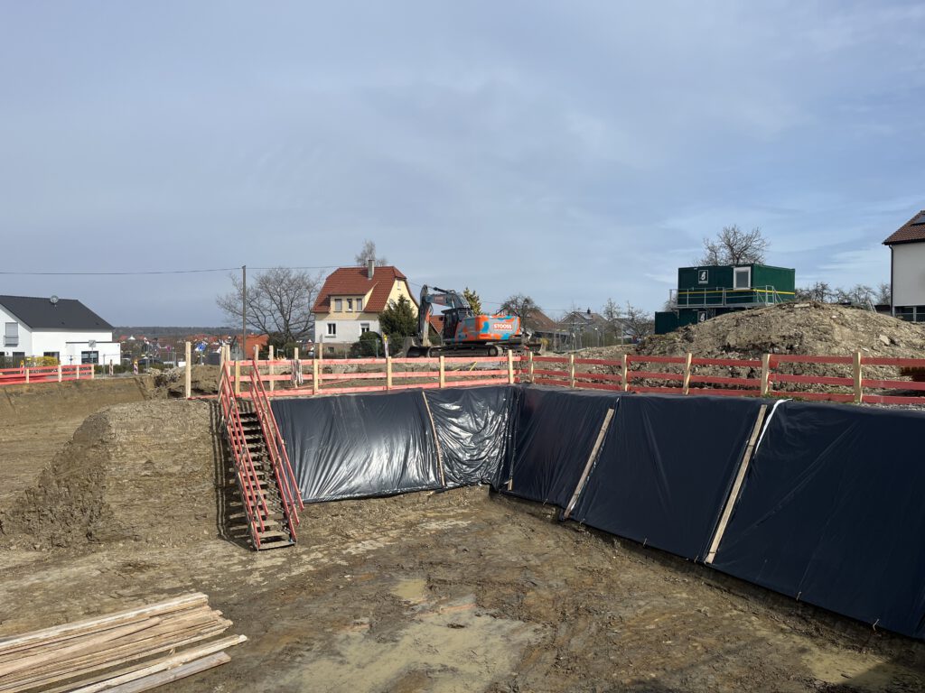 Danach konnte der Erdaushub richtig durchstarten. Zu Höchstzeiten wurden mehrere hundert Tonnen pro Tag abgefahren, damit Tiefgarage und Kellerräume ihren Platz finden. Ein großer Dank an unsere Nachbarn, die sich auf den schnelle Baufortschritt fokussieren und uns so wohlwollend begleiten: „Das Abtransportieren der Erdmassen war beeindruckend. Im 5 Minutentakt sind die Lastwagen gefahren. Die Logistik: überwältigend.“